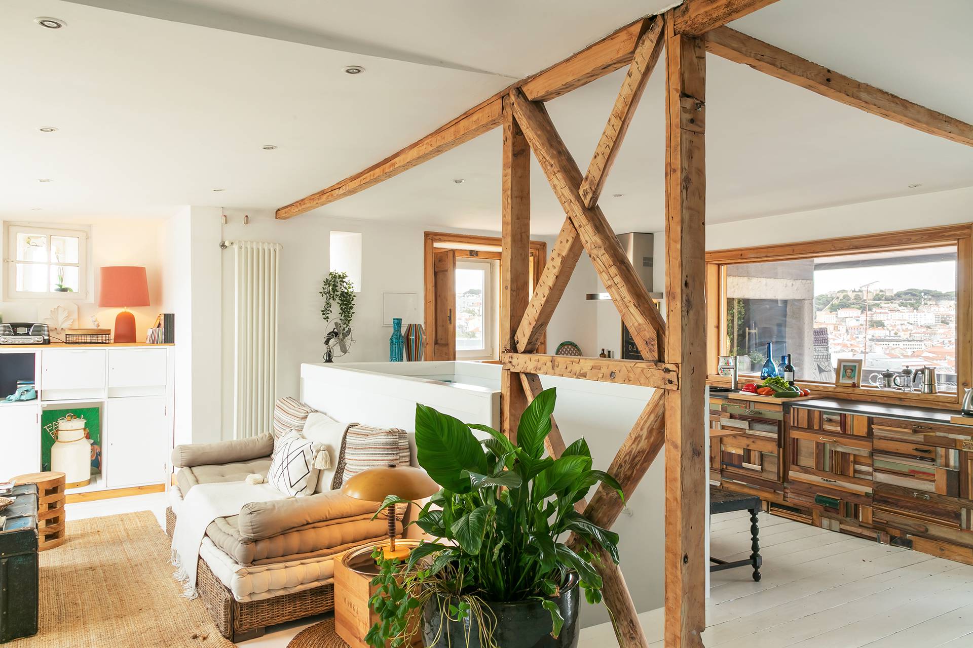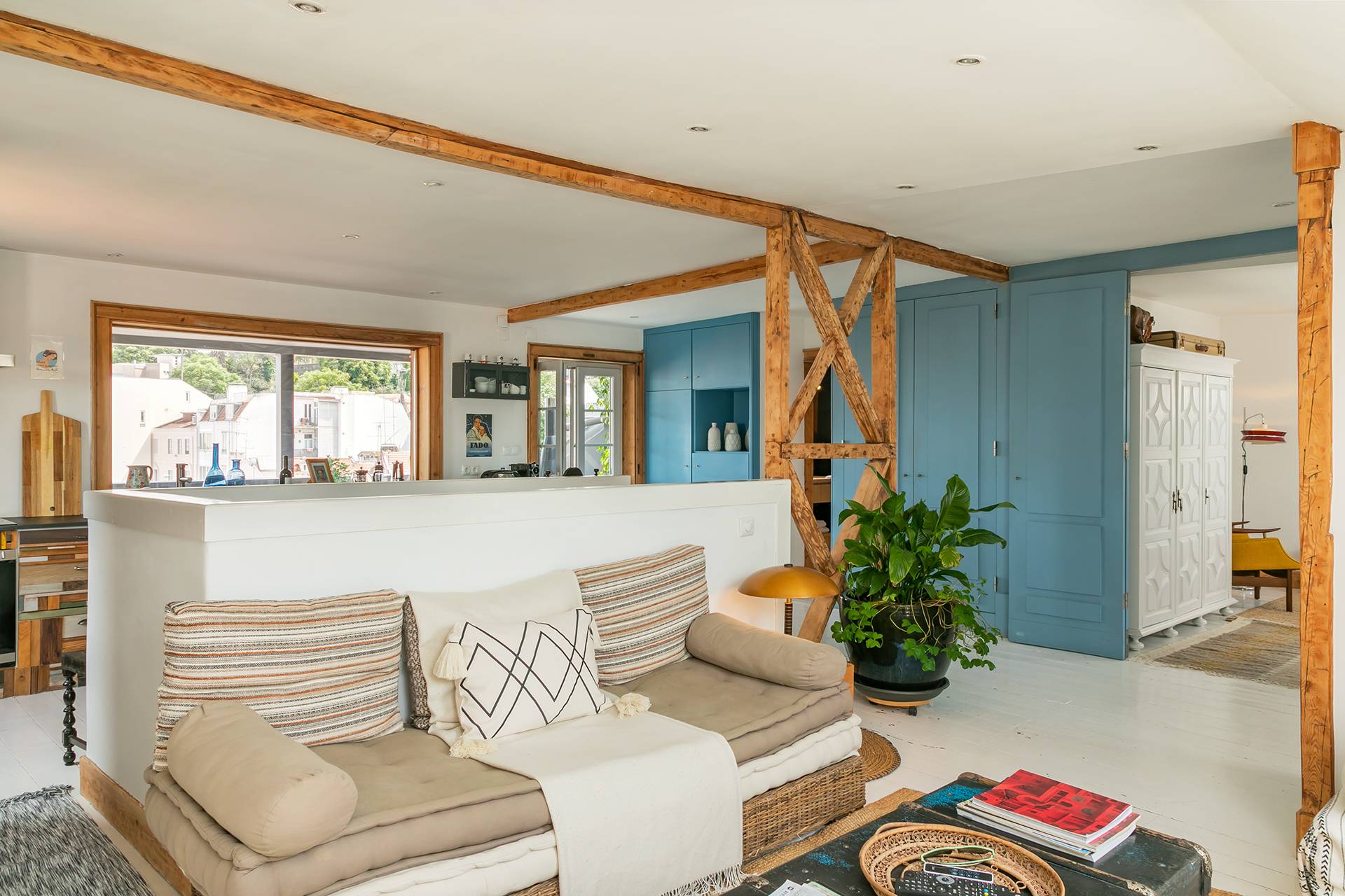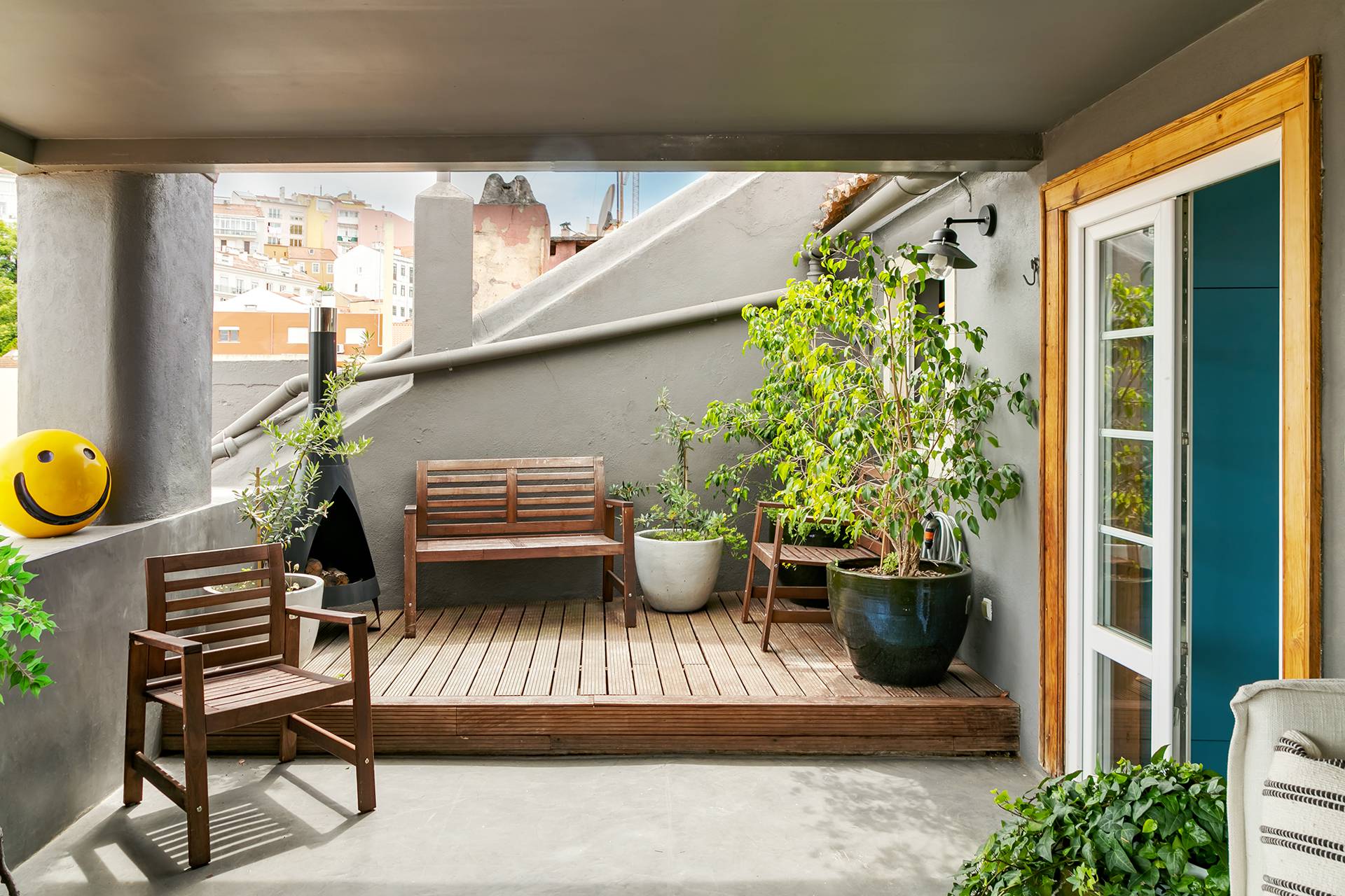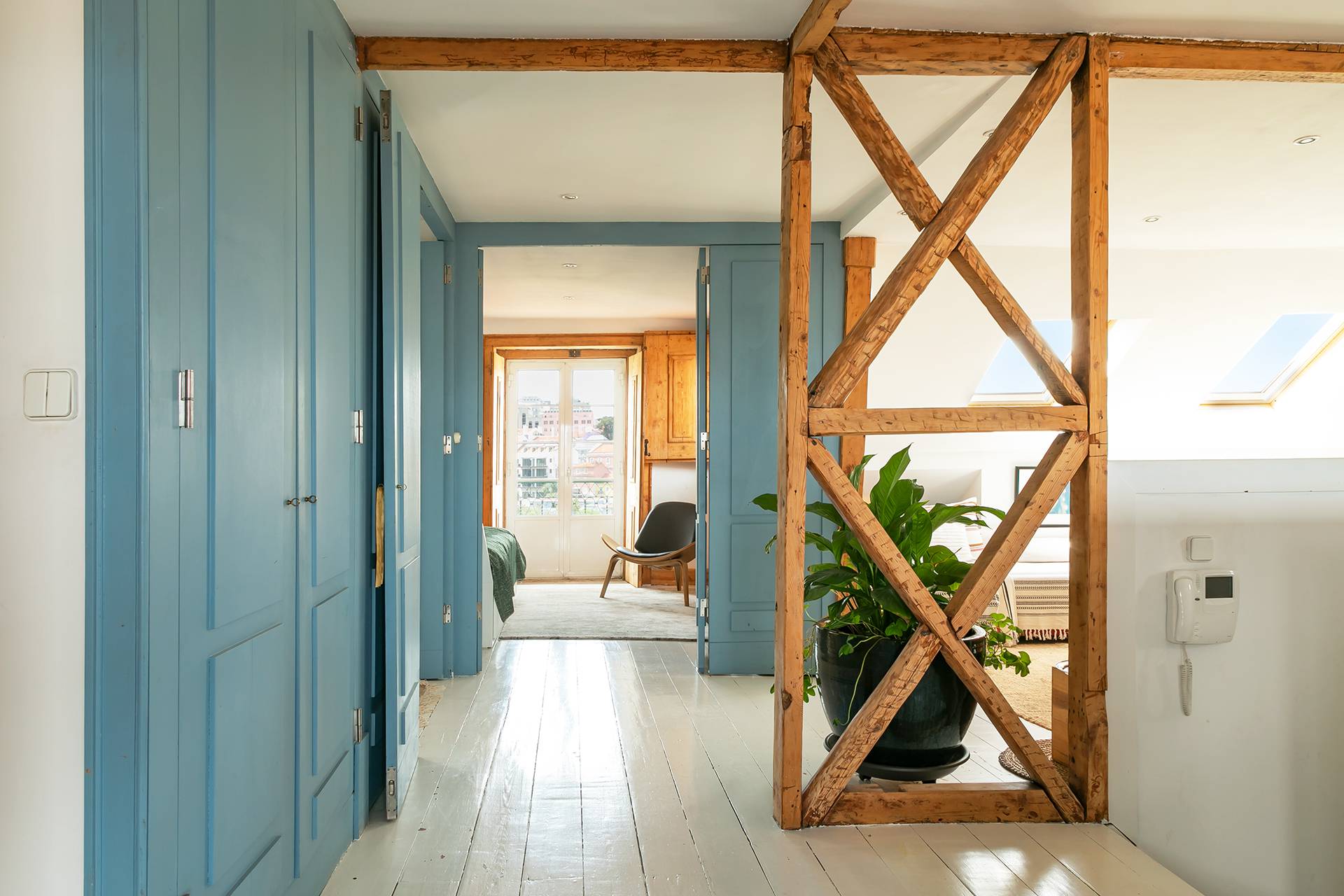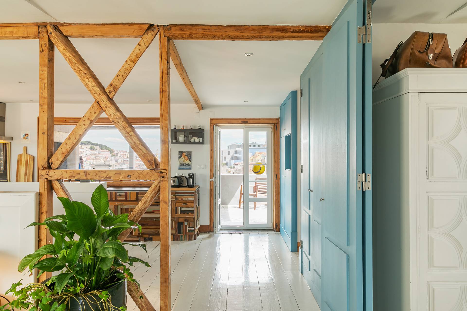 The wood tones mixed with blue paint and green plants create a special charm inside of this pretty apartment with a terrace and a view of Lisbon. Cozy and refined, it is the ideal spot for your next trip to Lisbon.