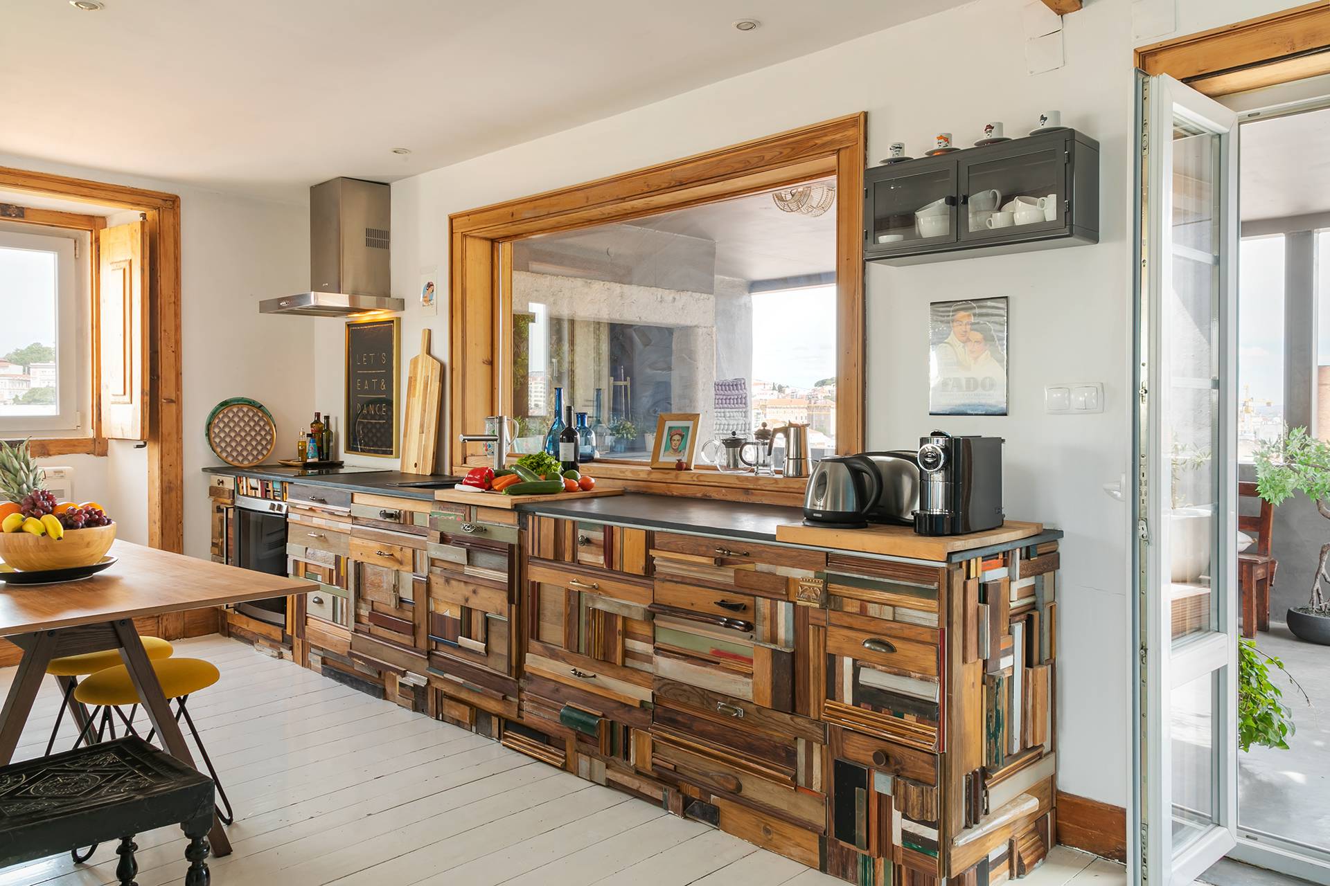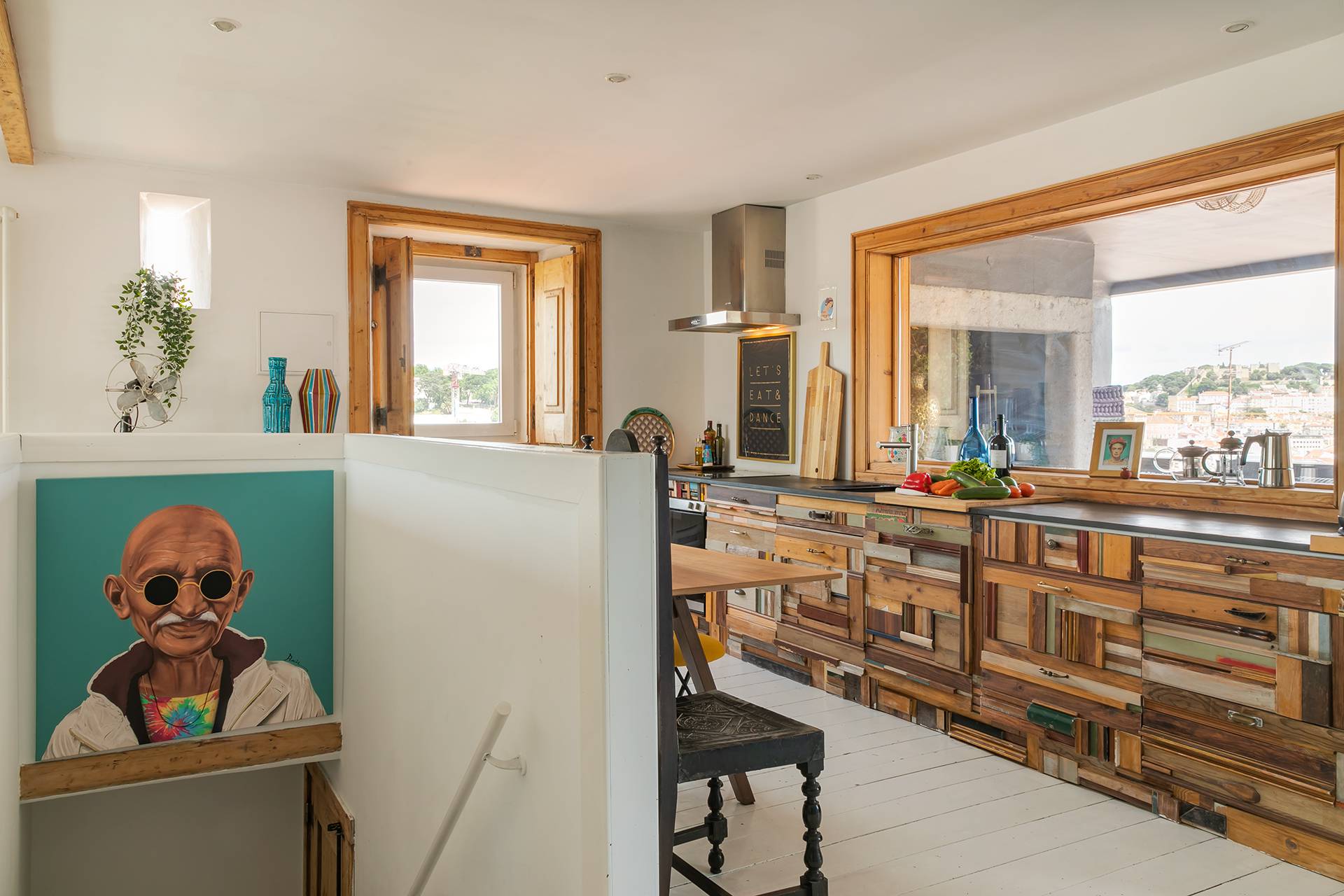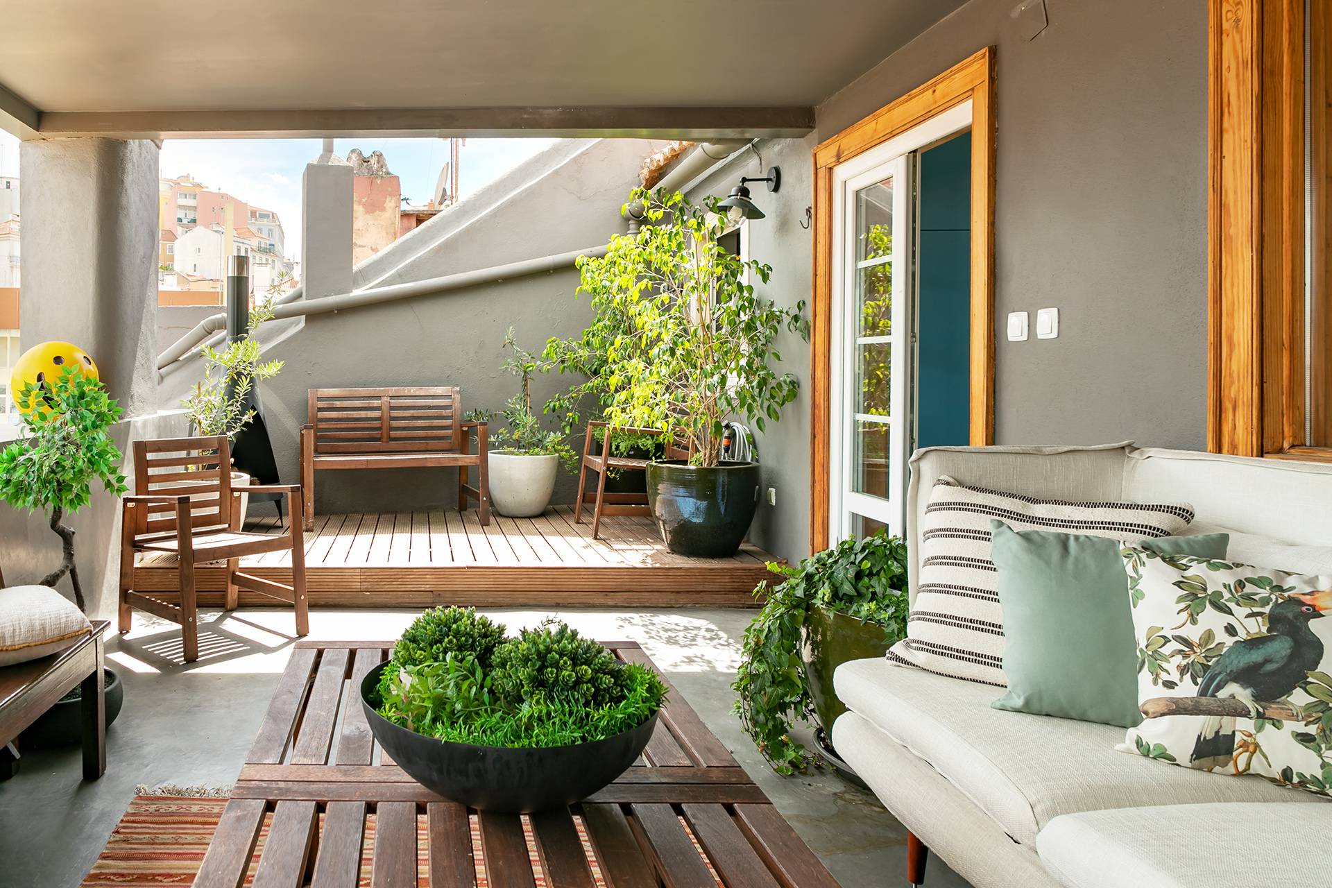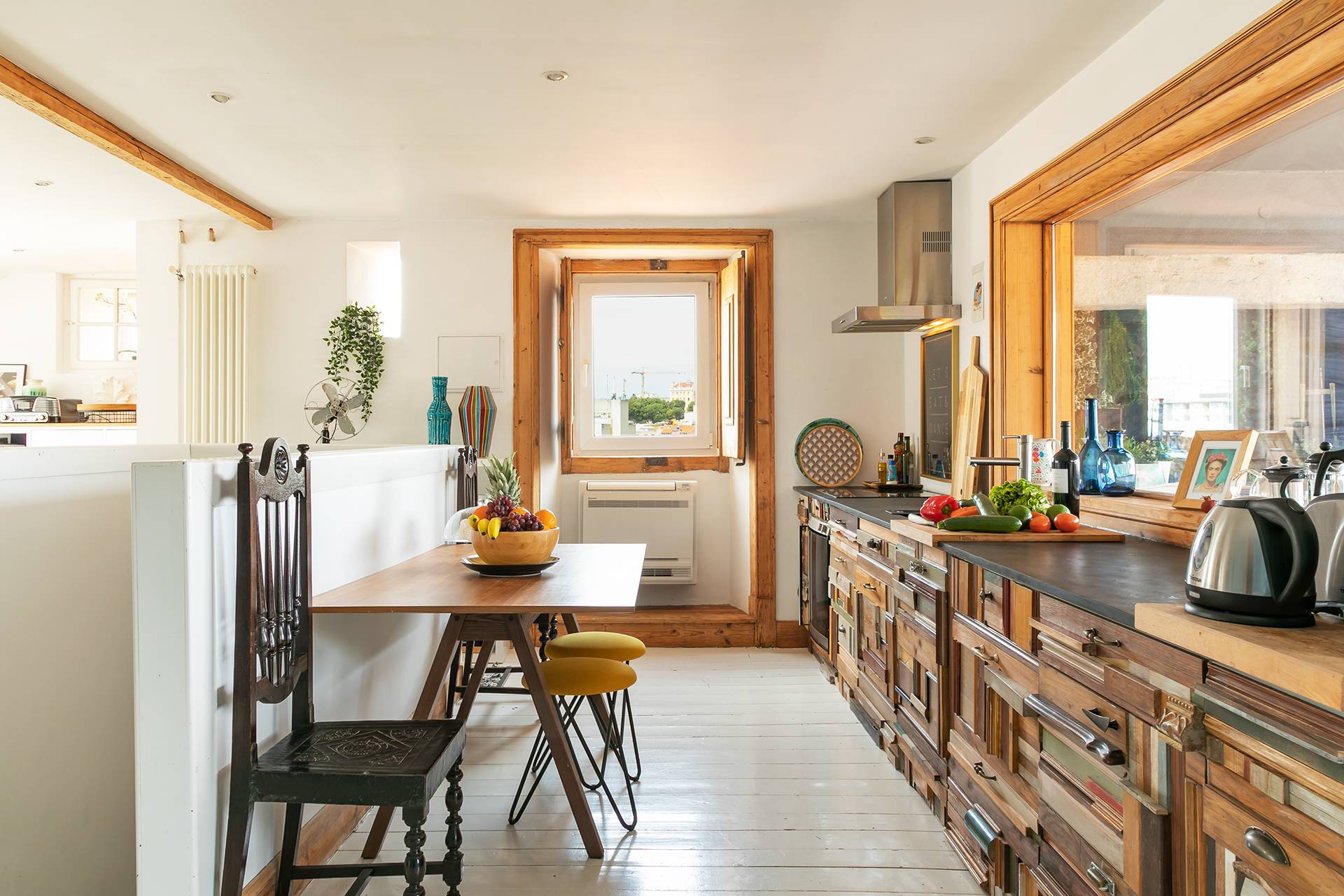 The wood tones mixed with blue paint and green plants create a special charm inside of this pretty apartment with a terrace and a view of Lisbon. Cozy and refined, it is the ideal spot for your next trip to Lisbon.
