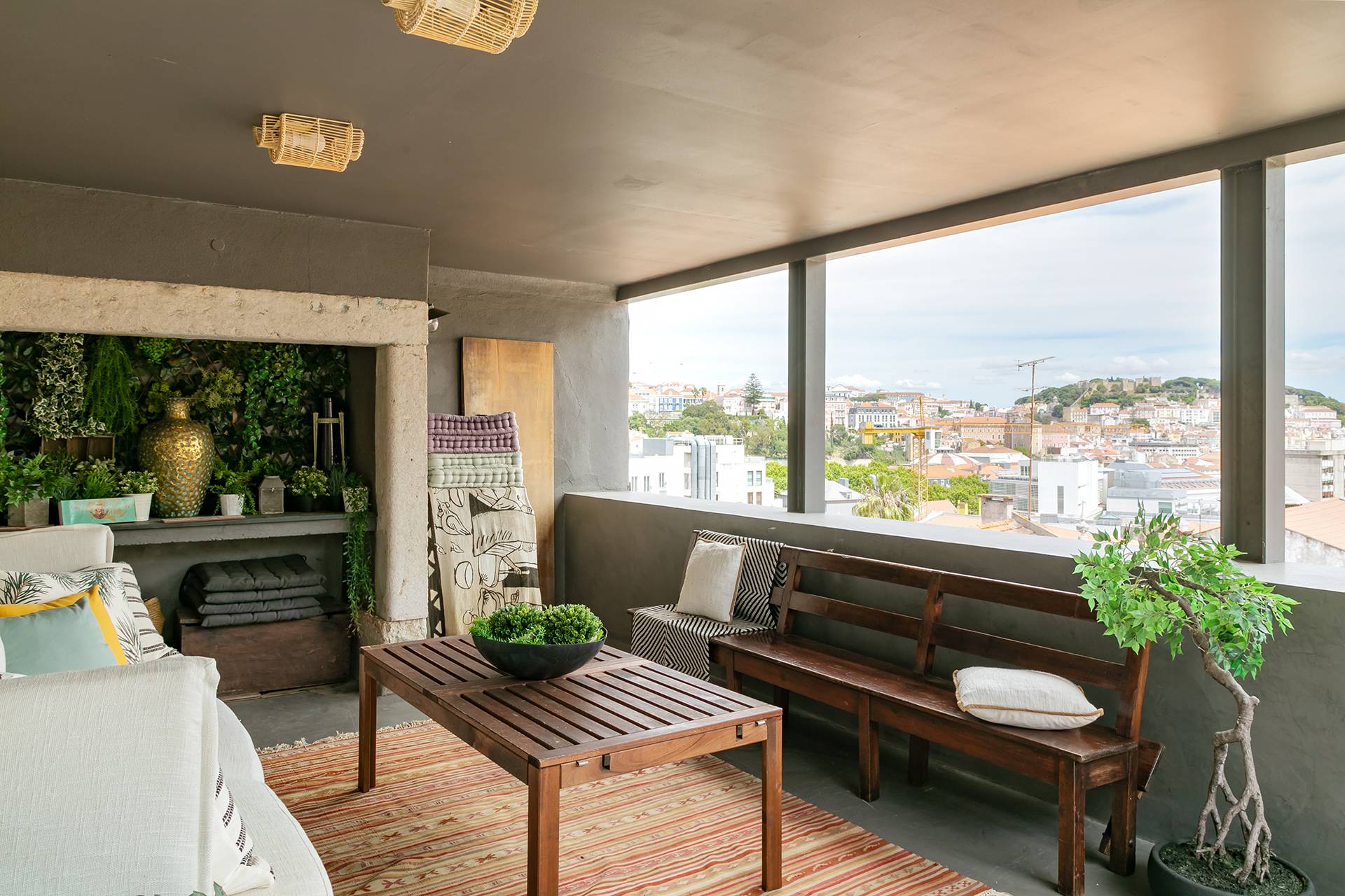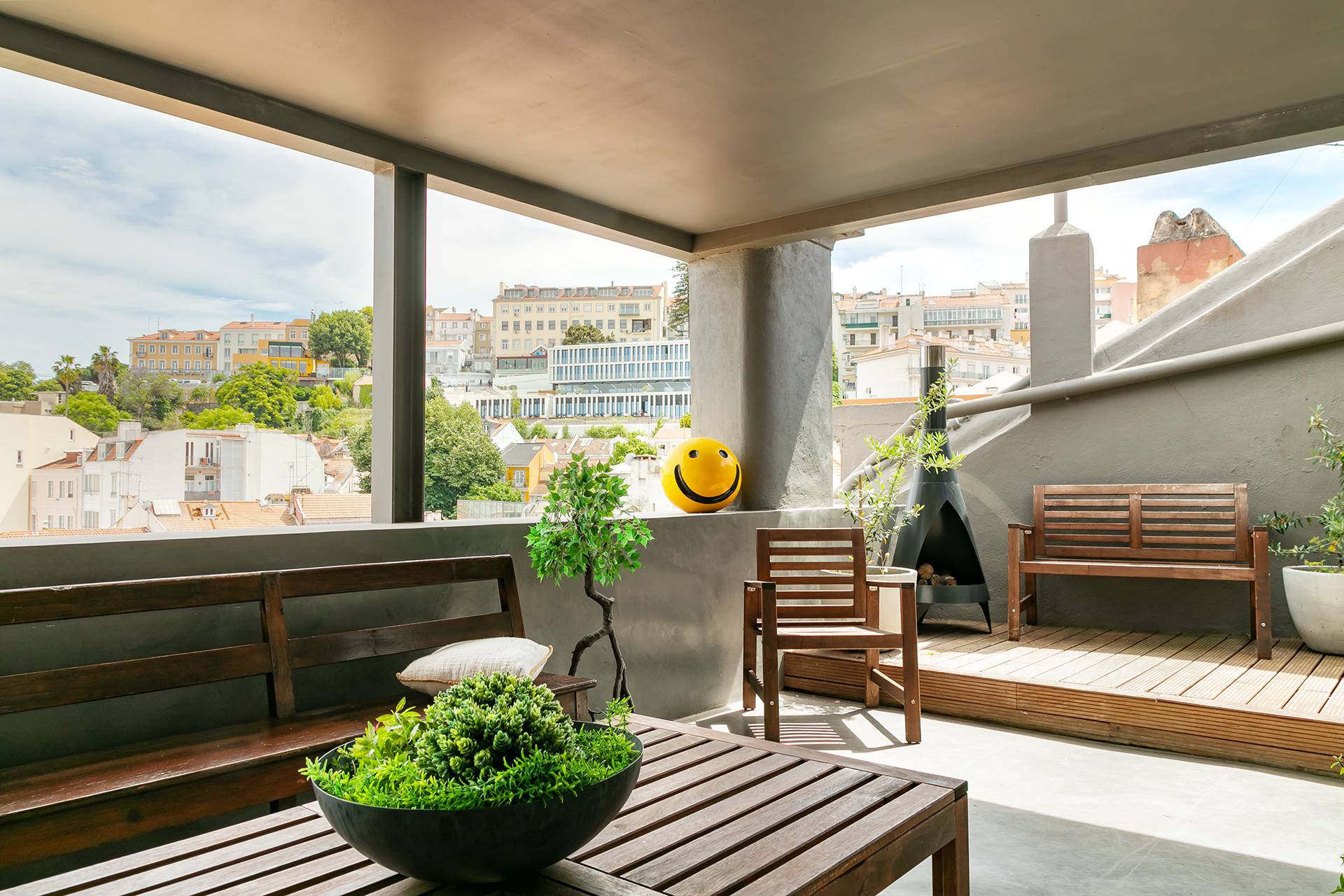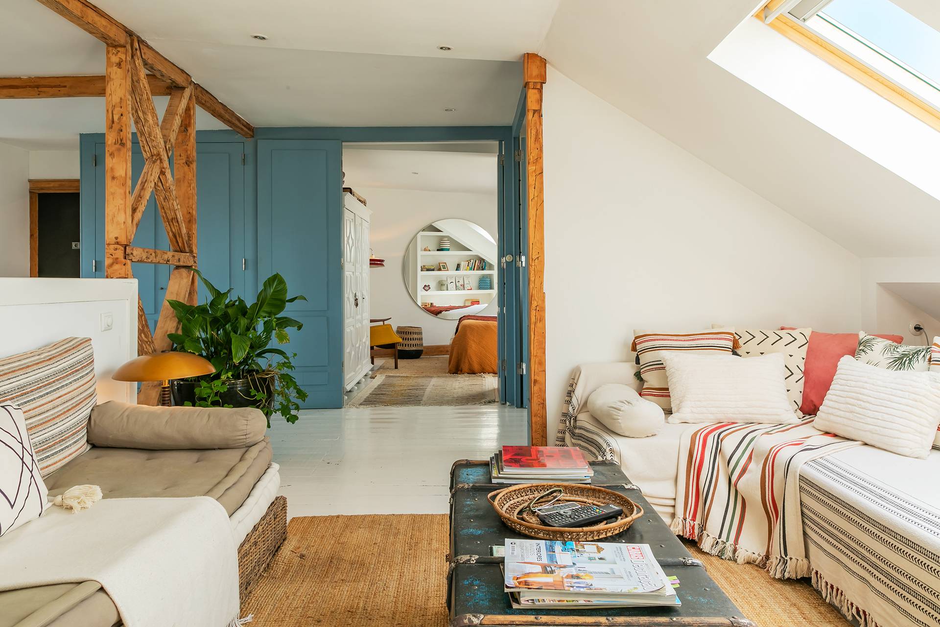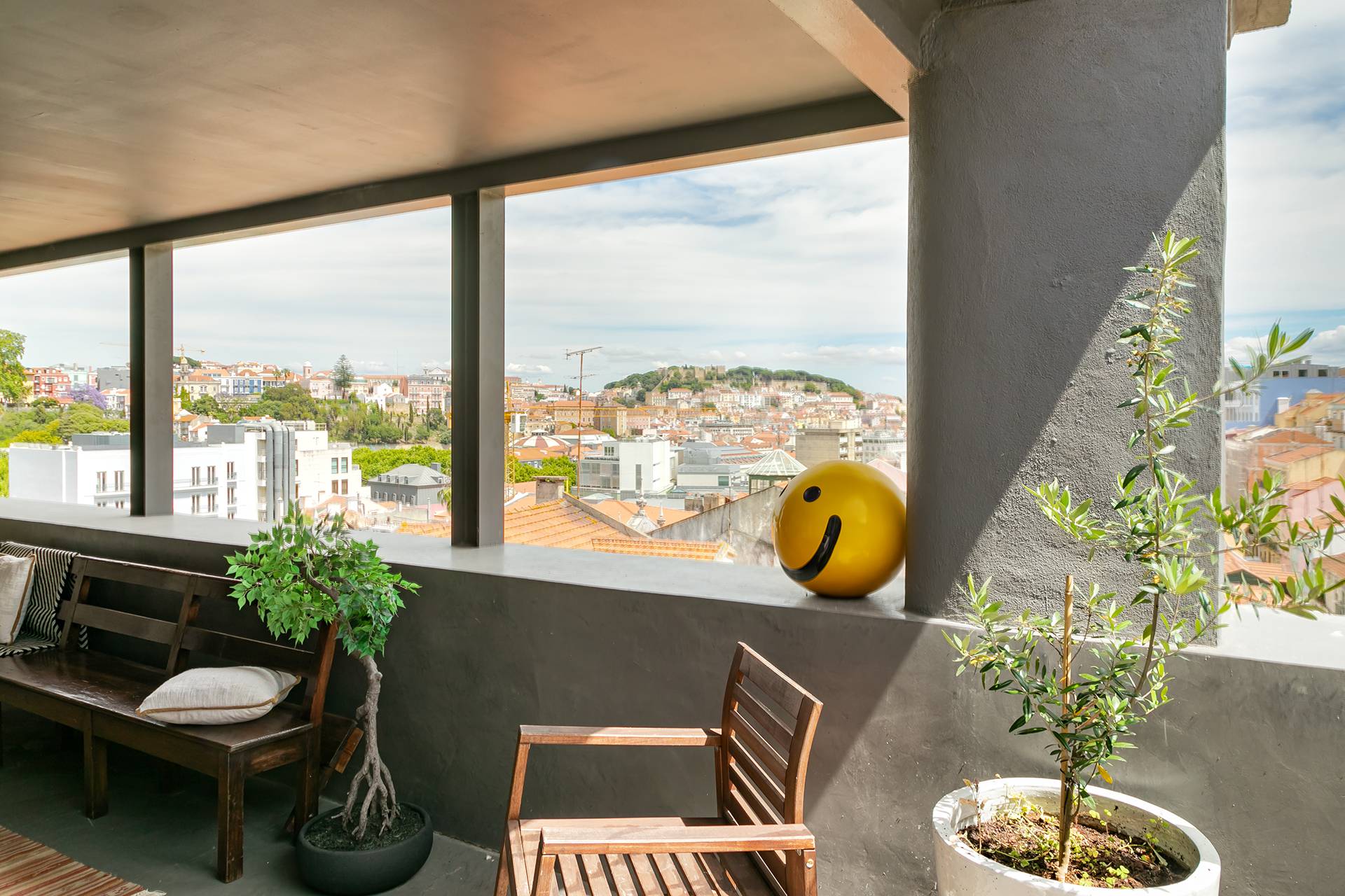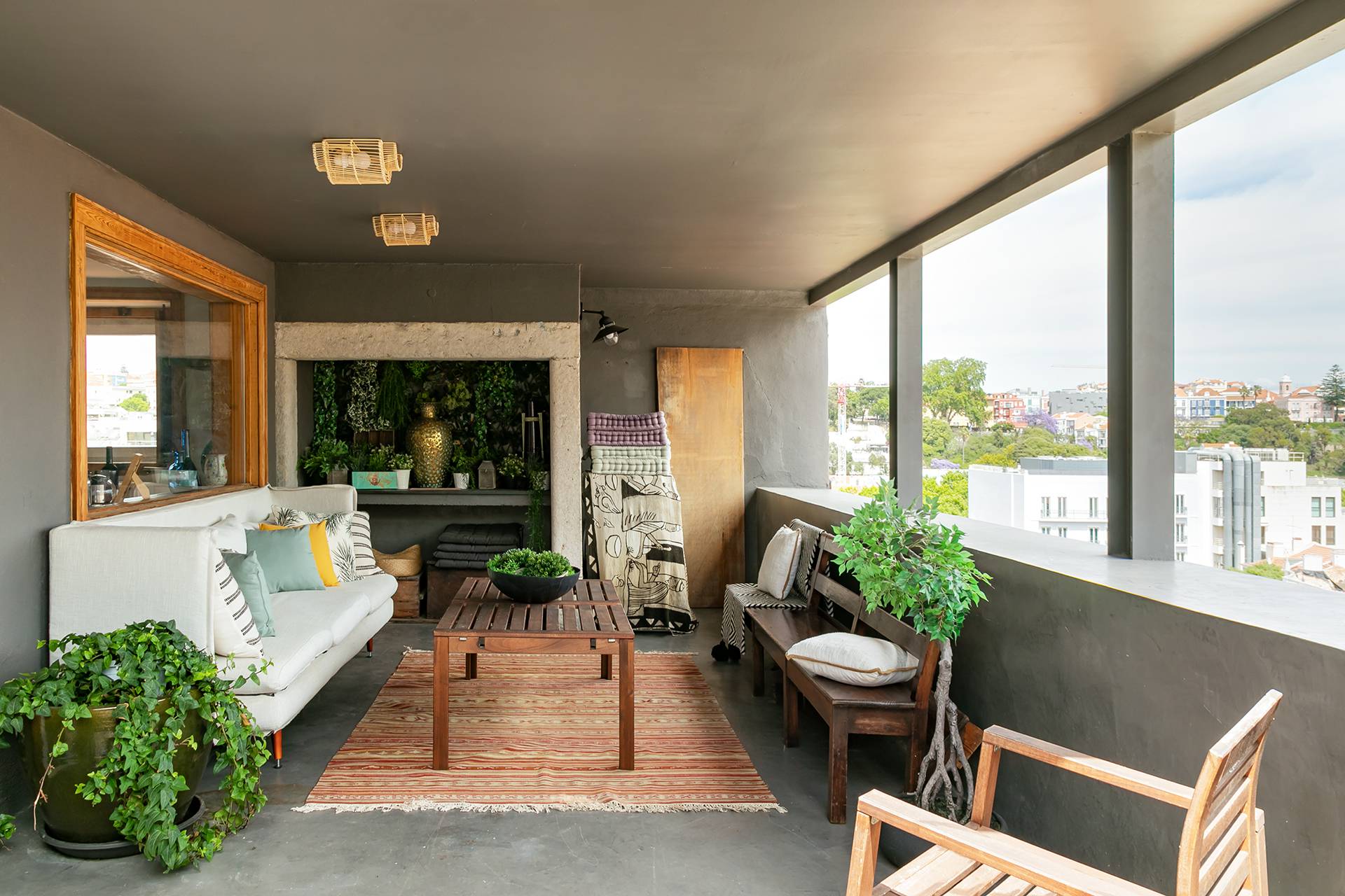 The wood tones mixed with blue paint and green plants create a special charm inside of this pretty apartment with a terrace and a view of Lisbon. Cozy and refined, it is the ideal spot for your next trip to Lisbon.