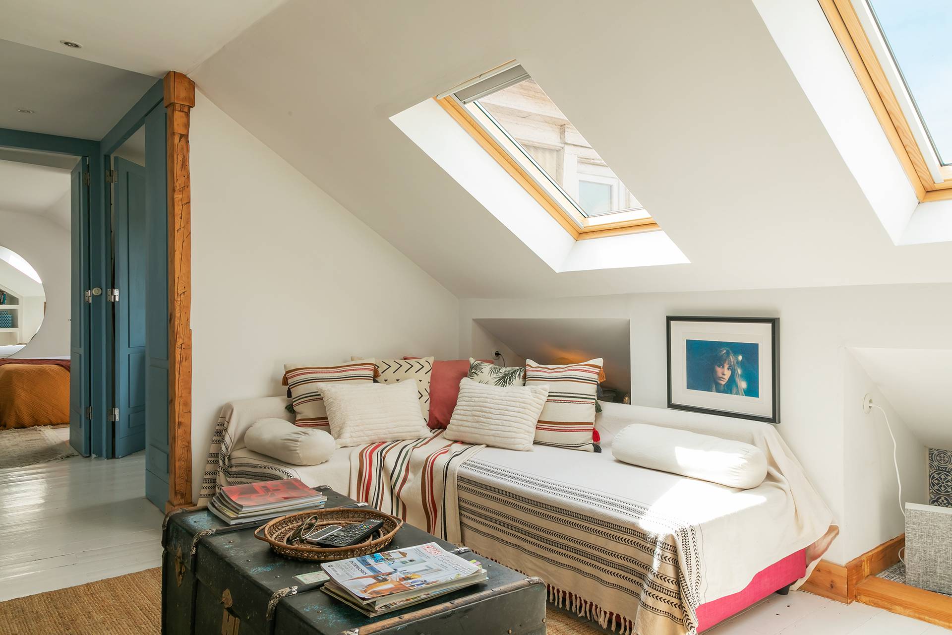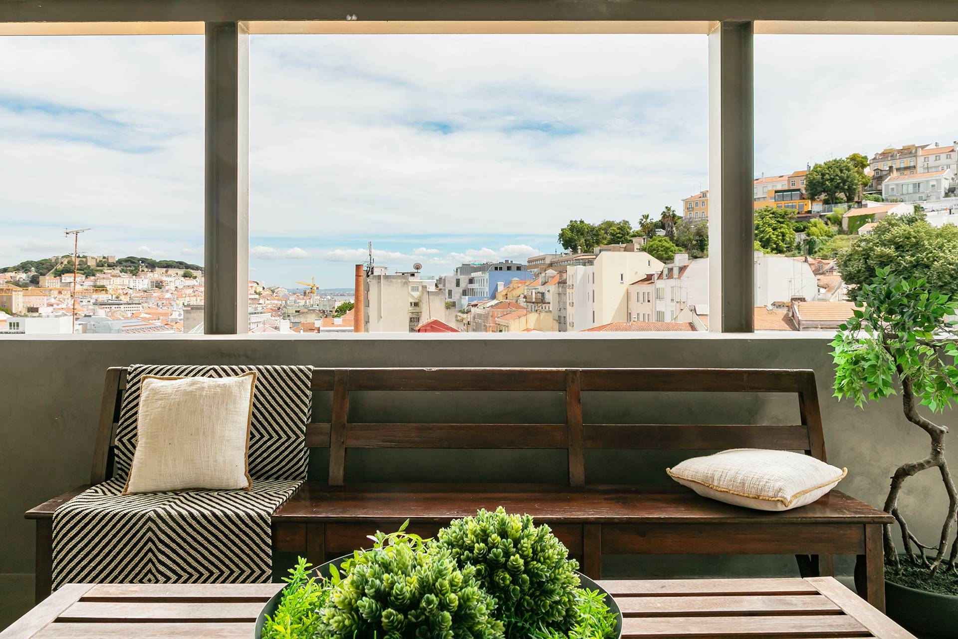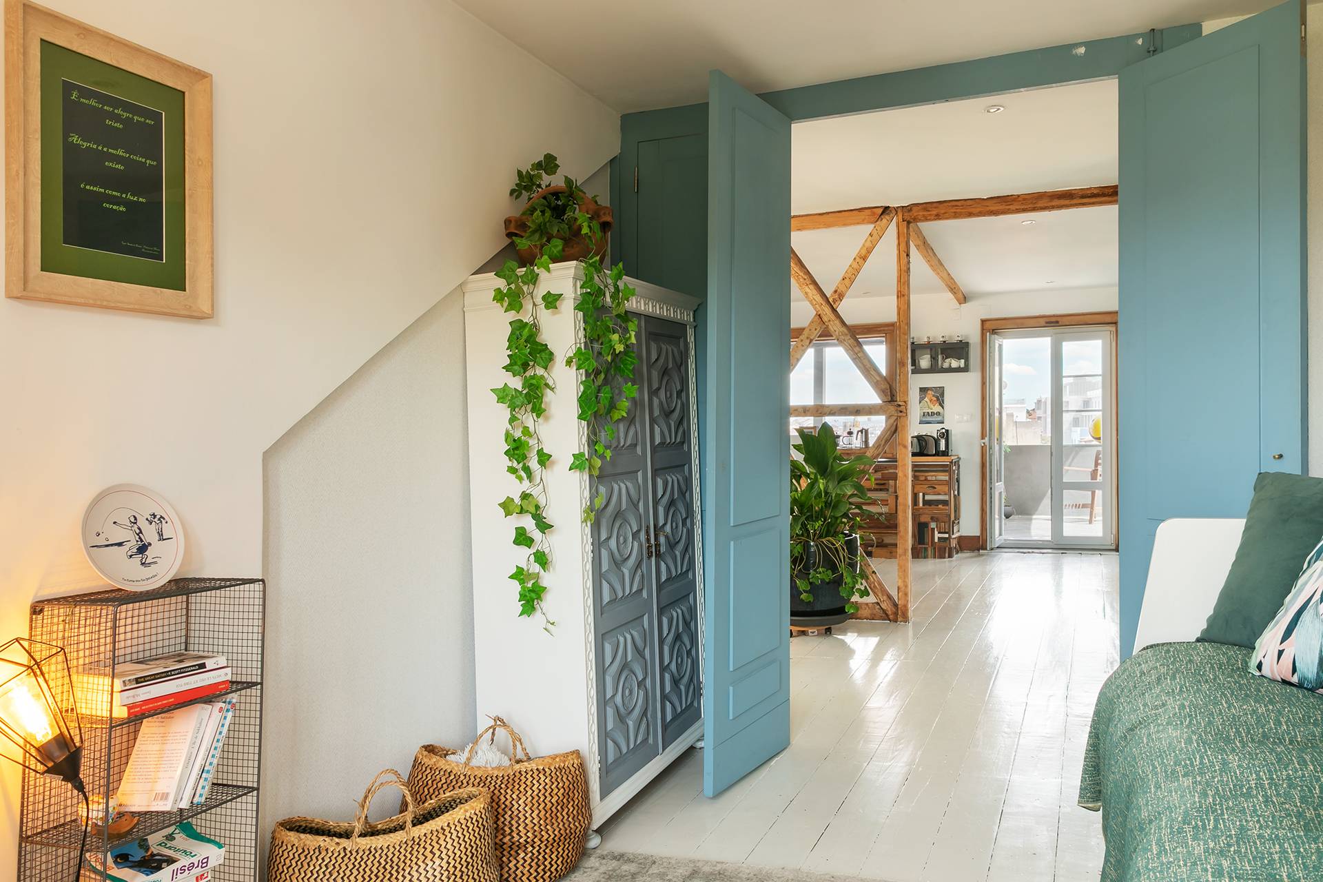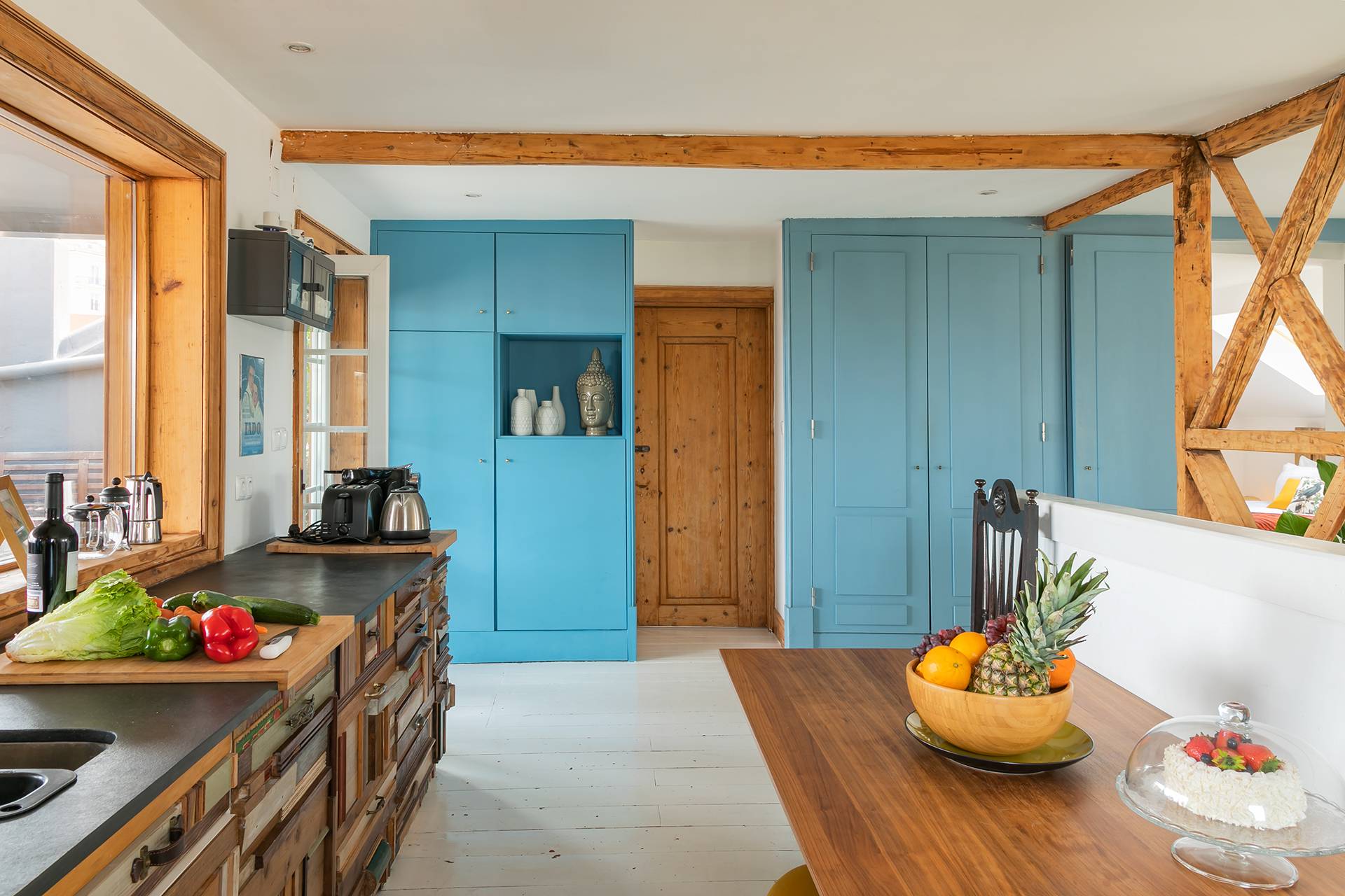 The wood tones mixed with blue paint and green plants create a special charm inside of this pretty apartment with a terrace and a view of Lisbon. Cozy and refined, it is the ideal spot for your next trip to Lisbon.