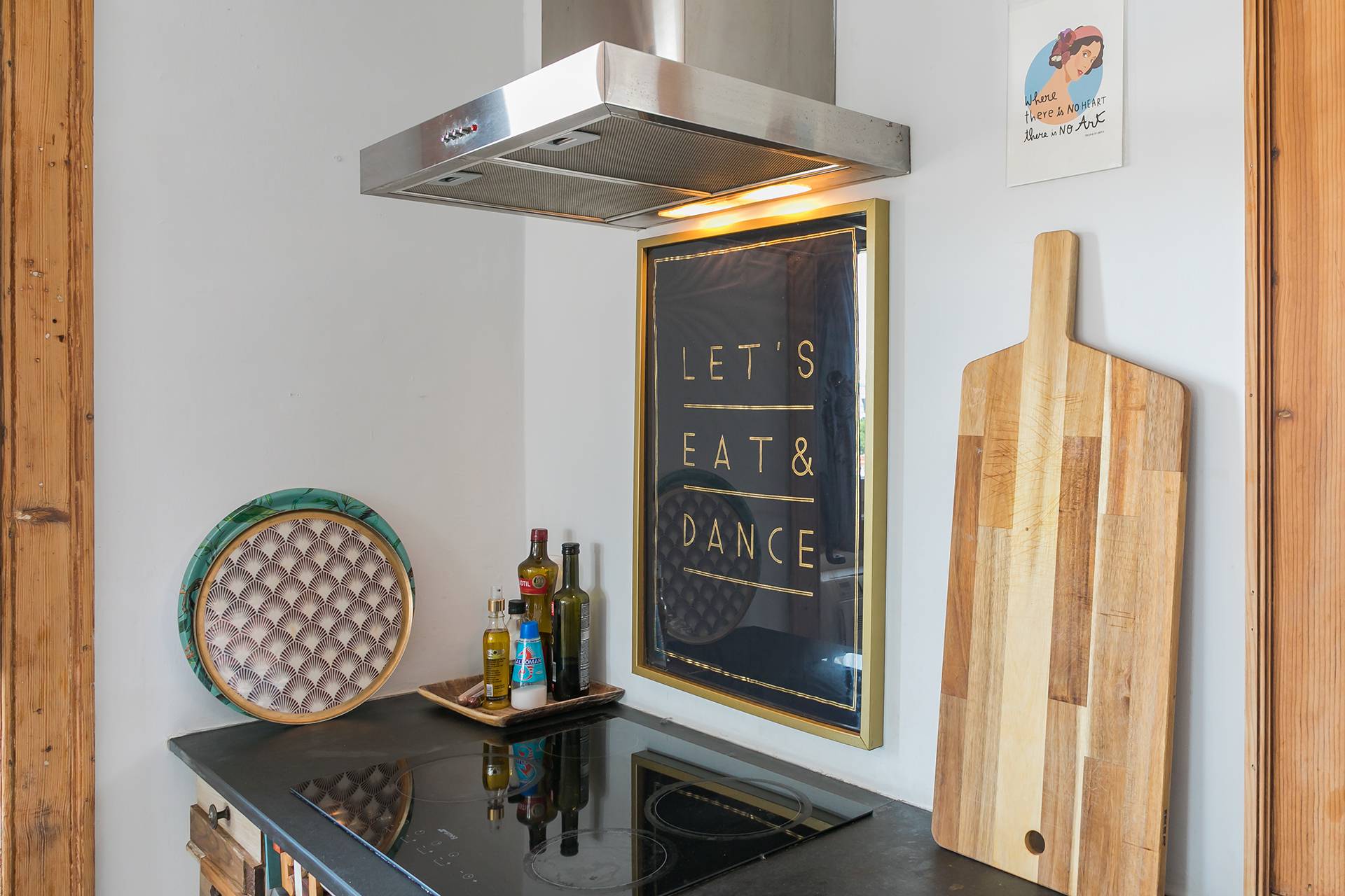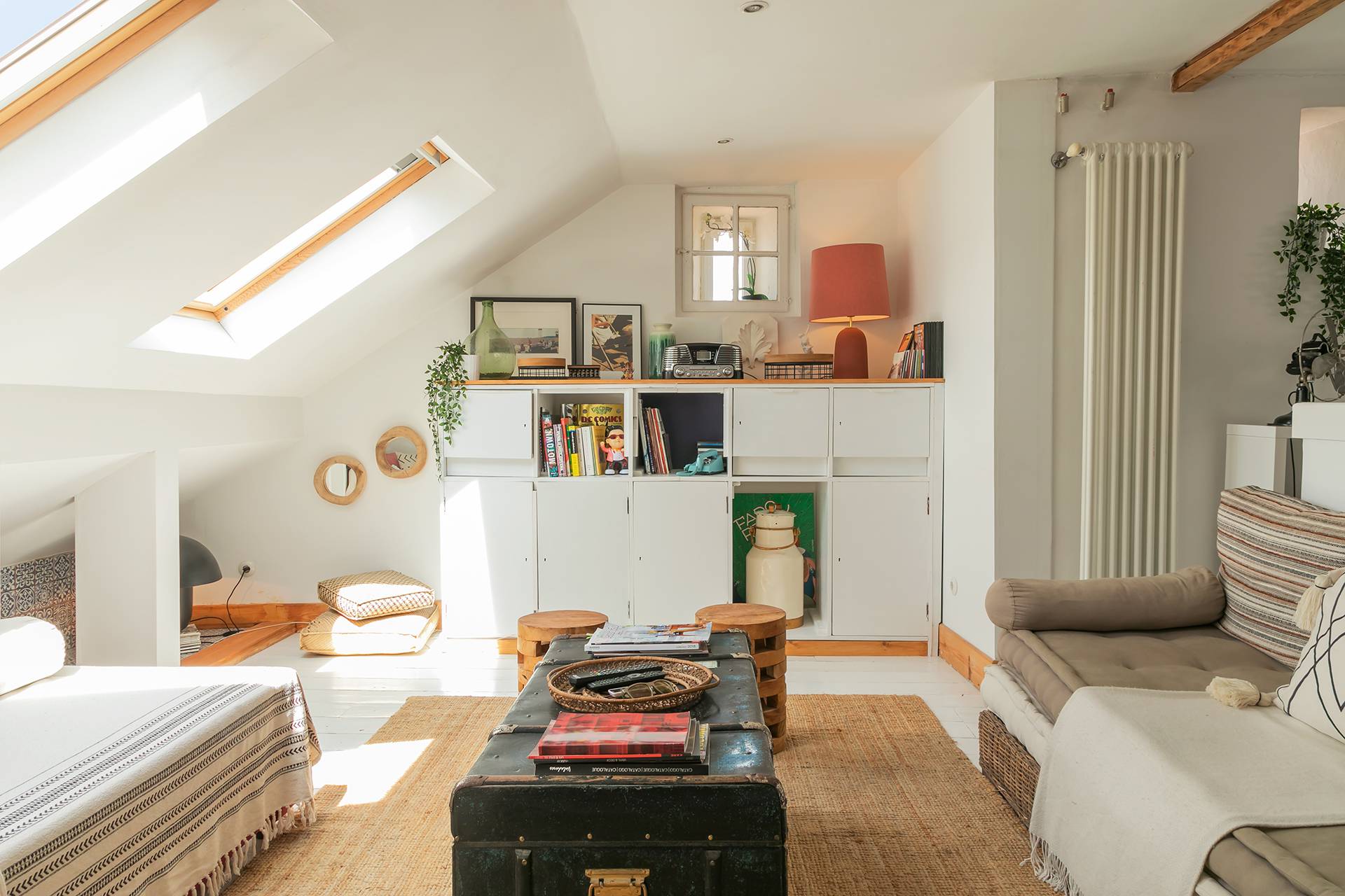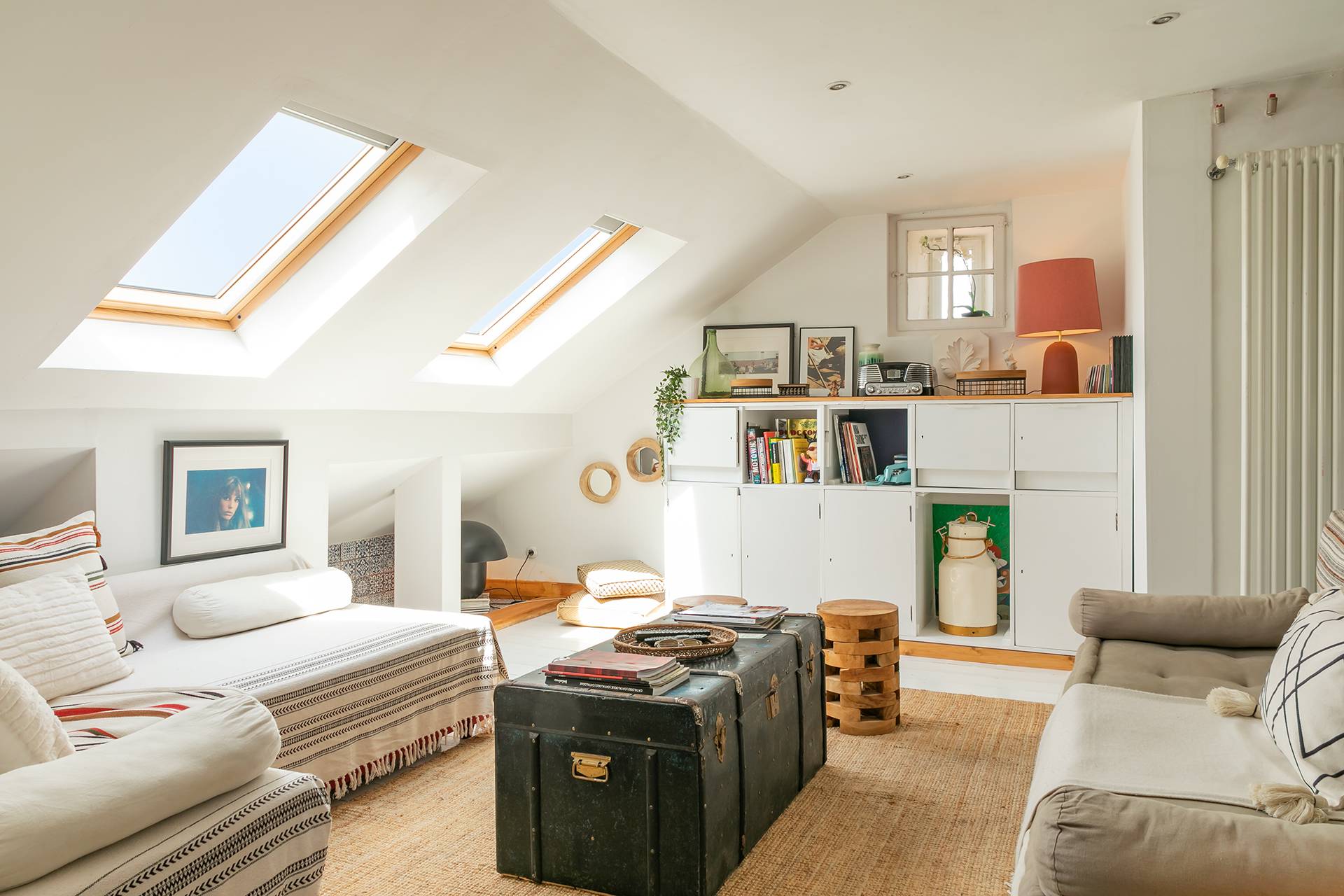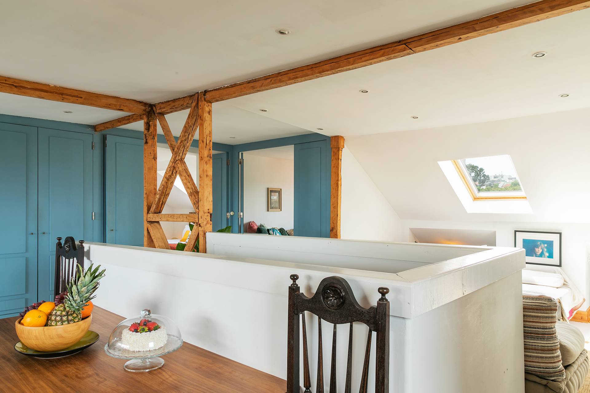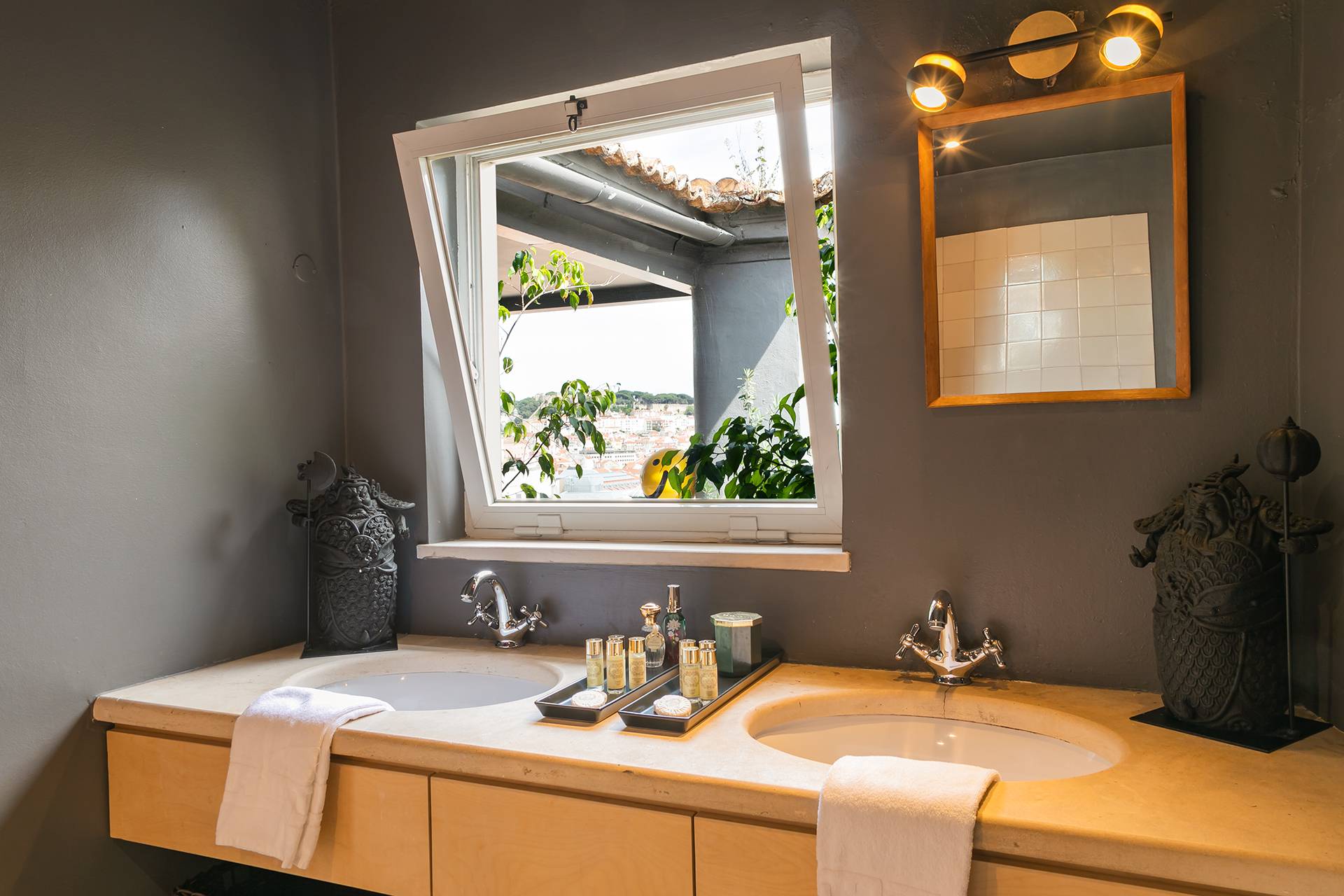 The wood tones mixed with blue paint and green plants create a special charm inside of this pretty apartment with a terrace and a view of Lisbon. Cozy and refined, it is the ideal spot for your next trip to Lisbon.