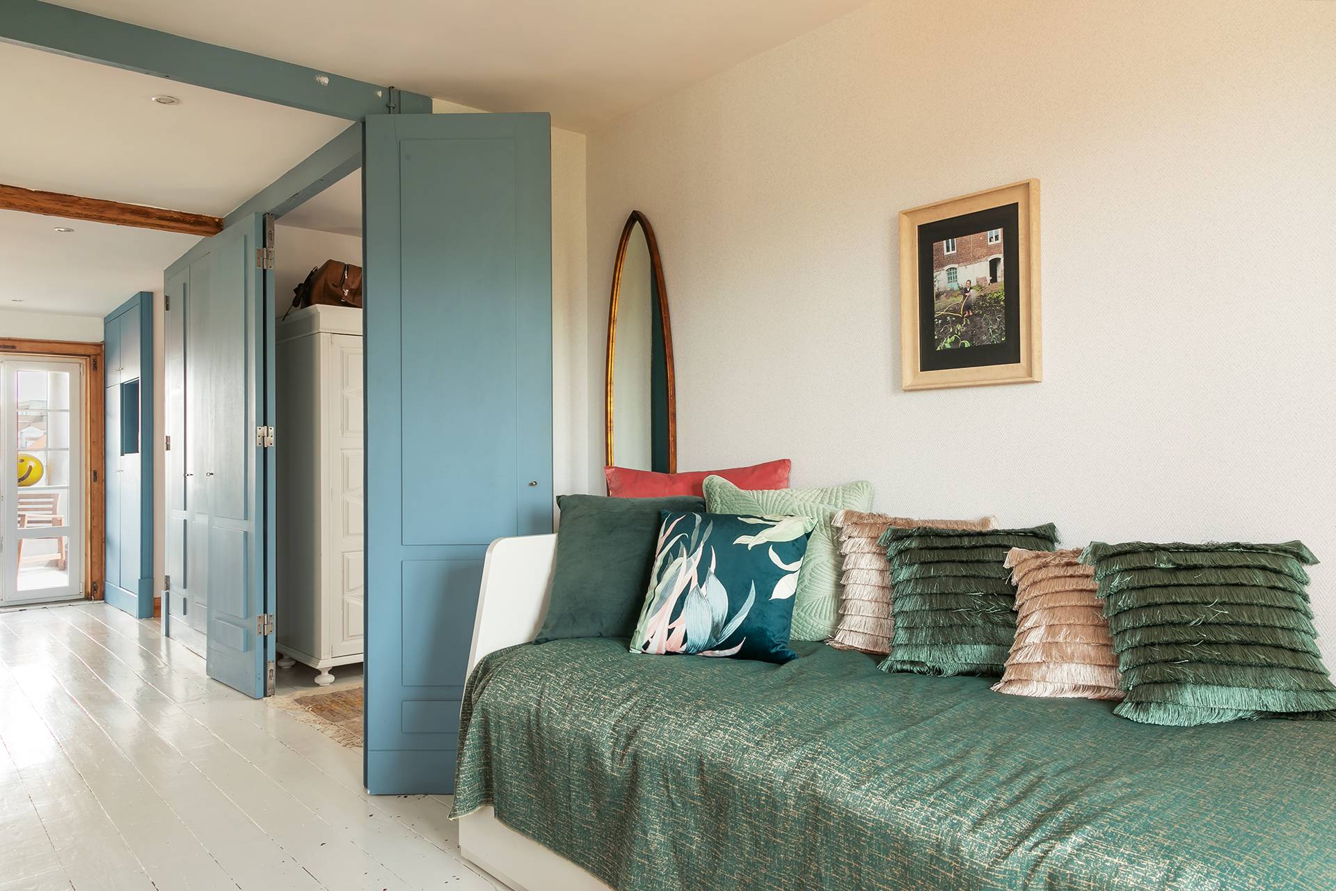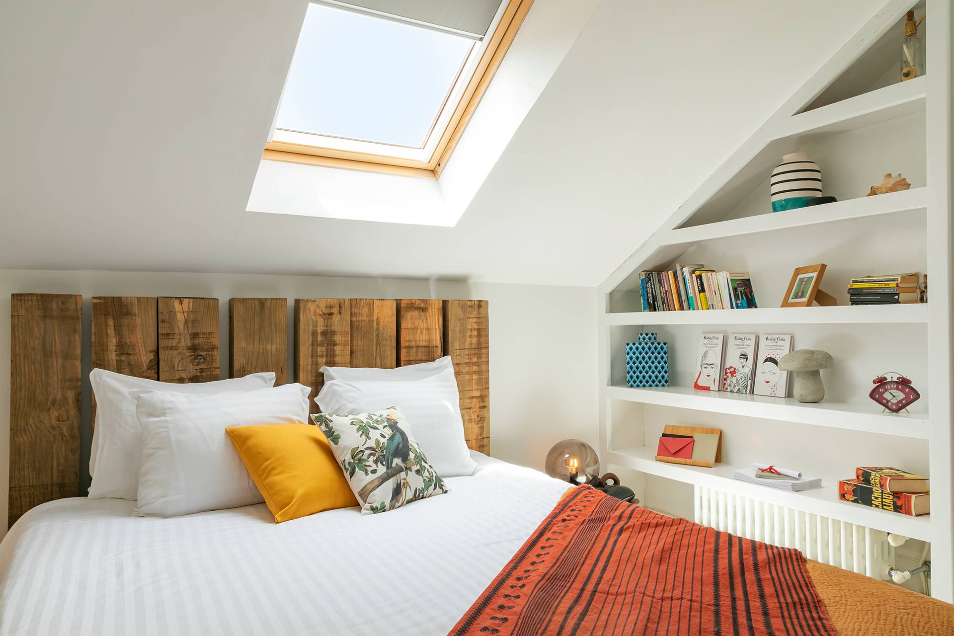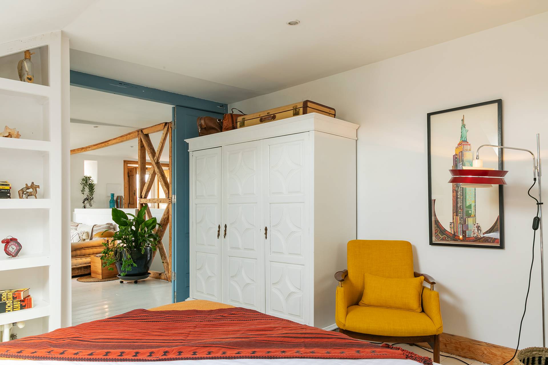 The first is a double bedroom located on the left of the living room. Its large, round mirror dresses up the room. A pretty, white dresser is across from the bed which itself is lined with several shelves of decorative objects.